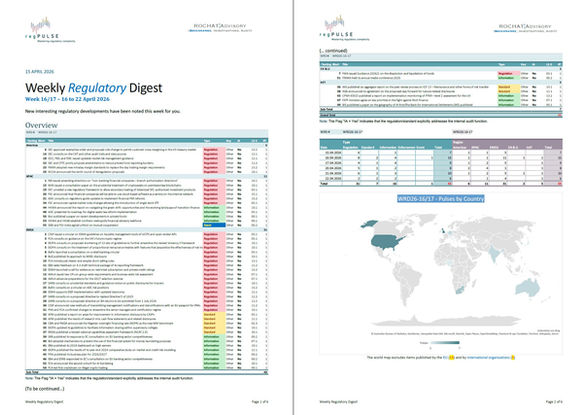 ROCHAT¦Advisory is specifically providing services in the area of regulatory governance for financial institutions, with emphasis on monitoring important changes to regulations, rules, standards and best practices by key regulators and standard setters in major jurisdictions. With regPULSE, subscribers find relevant regulatory updates at their fingertips through delivery of high-performance reports, such as a "Regulatory Digest" typically distributed on a weekly basis. [Explore further...]